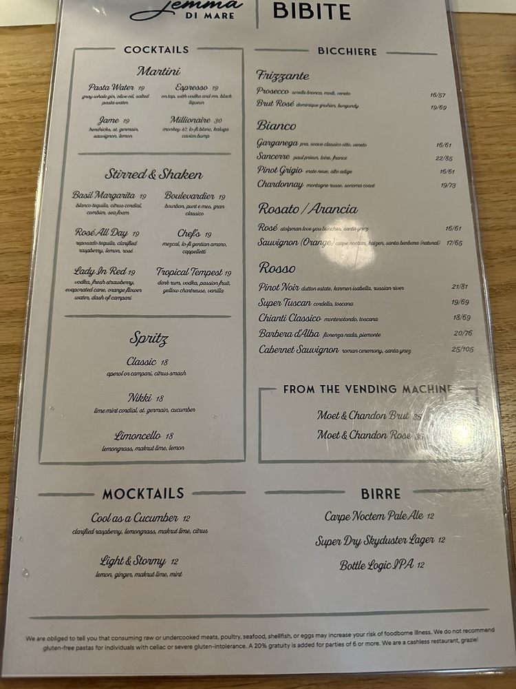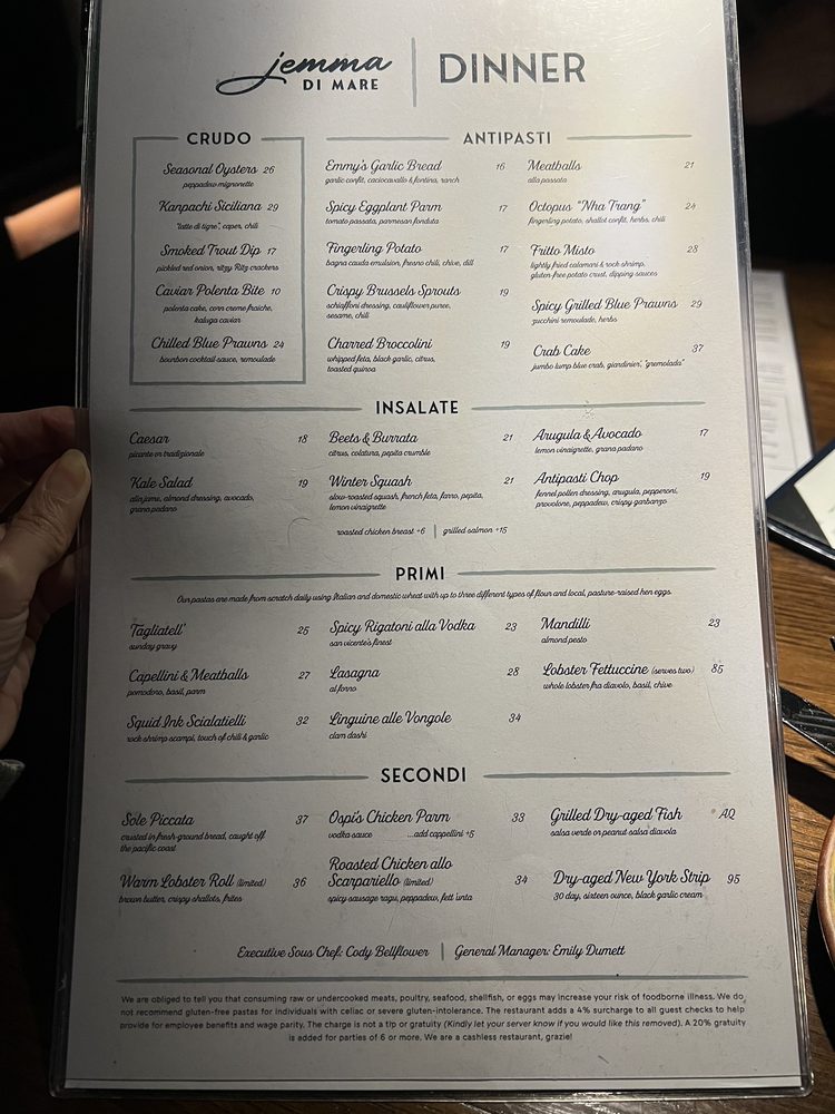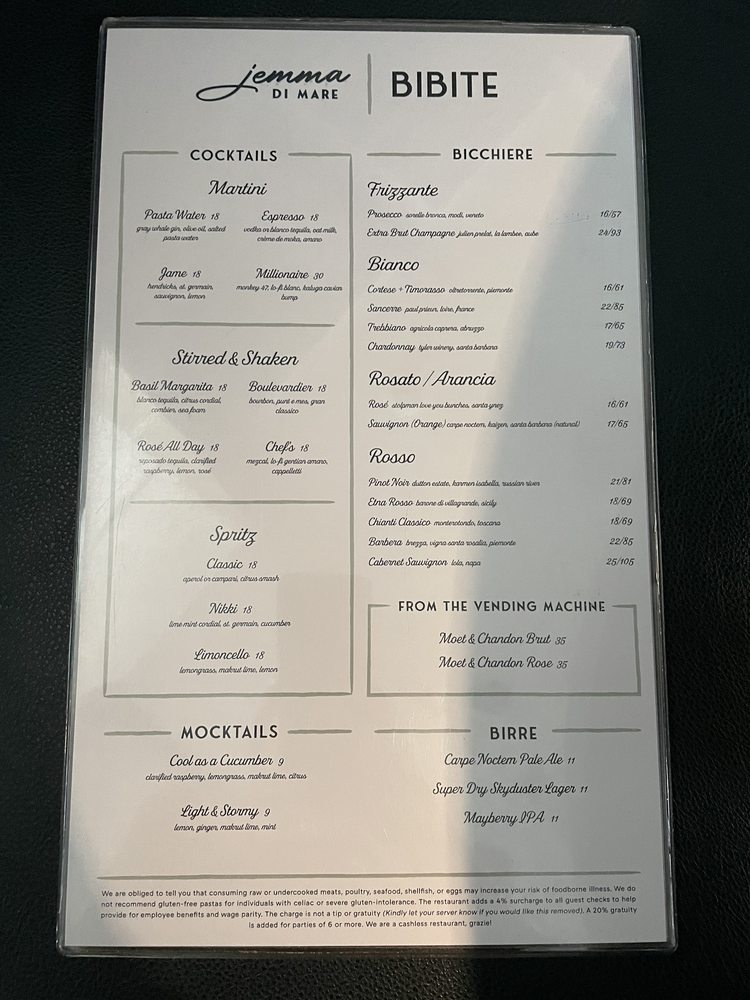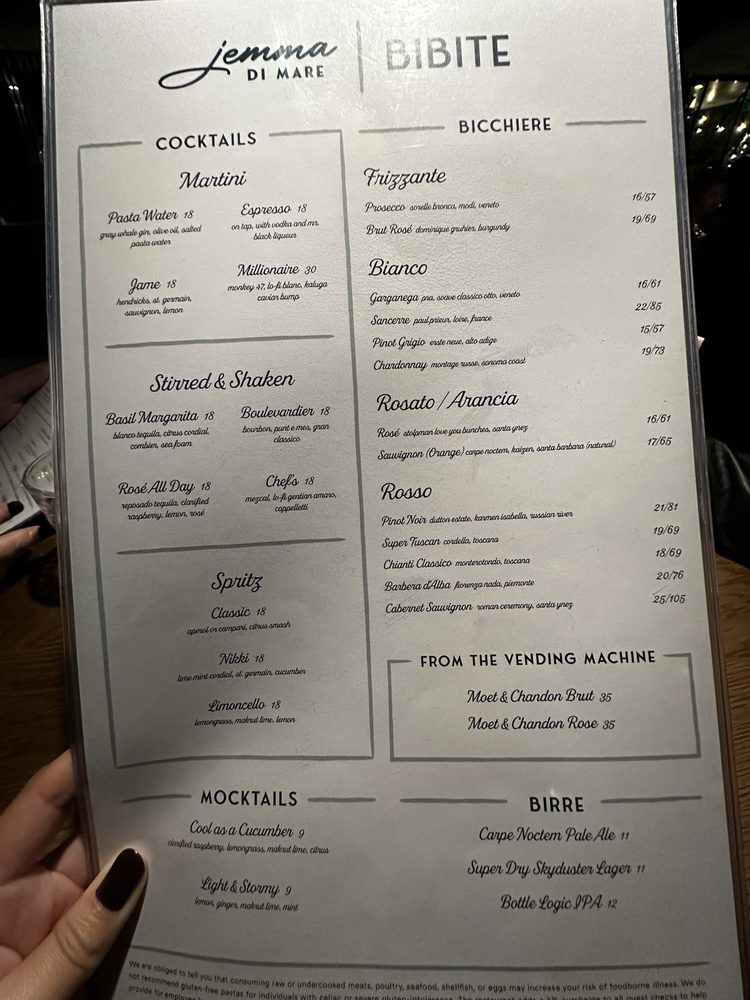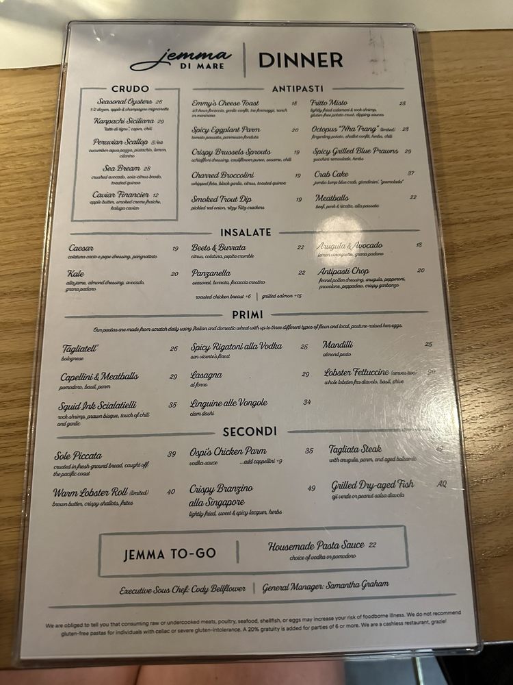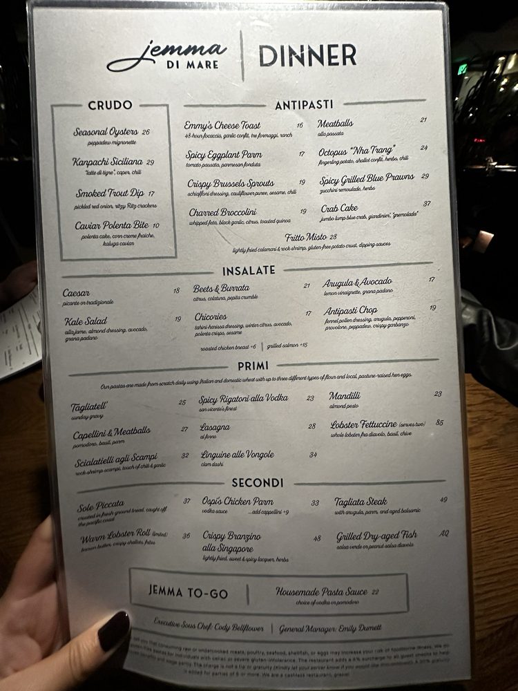 Jemma di Mare is a trendy and upscale cocktail bar offering Italian and seafood cuisine in Los Angeles. The restaurant provides a classy ambiance with views of their kitchen, making the dining experience truly immersive. Customer reviews rave about the decadent Emmy's Cheese Toast and the flavorful fritto misto. The spicy rigatoni alla vodka stands out as a must-try dish, with perfect noodles and a delicious sauce. Desserts like lasagna and canolis receive high praise for their taste and presentation. The restaurant also offers a great happy hour deal and a variety of cocktails. Overall, Jemma di Mare impresses with its fantastic food, attentive service, and inviting atmosphere, making it a perfect spot for a date night or a gathering with friends.